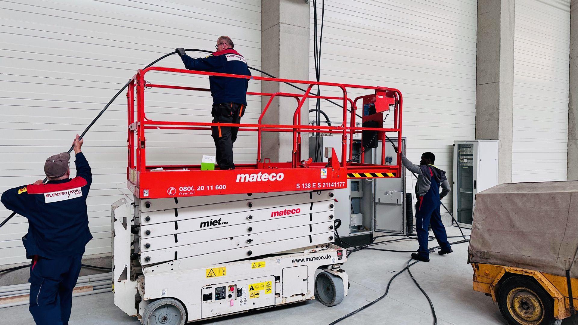Eine neue Industriehalle in Frankfurt/Oder: Da wird viel Energie benötigt, damit die Produktion bald auf Hochtouren laufen kann. Unser Projektleiter Michail hat ein erfahrenes Team zusammengestellt, um die Aufgaben schnell erfüllen zu können - und dies mit einer besonderen Herausforderung: Heute haben wir wieder in 12 Meter Höhe gearbeitet, da sollte man schwindelfrei sein! Die Leitungen müssen eben dorthin, wo sie gebraucht werden. Ob wir in die Höhe gehen oder in die Tiefe: Es wird hell und Strom fließt.